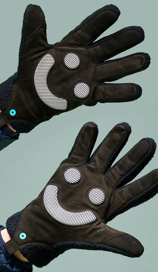 The smile on the palm of Big Fluffy is the same as our 3.0 glove. It is made from silicon which has two benefits: it stays super clean and it’s extra grippy. The padding underneath also relieves pressure in areas in constant contact with the handlebars.